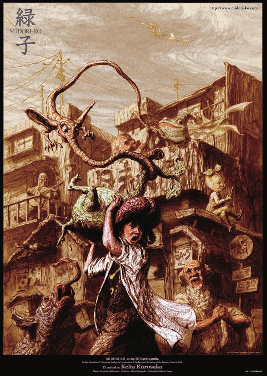 日本のアート・アニメーションのなかで、息もつかせぬ展開力と画力によってカルト的な人気をほこり、海外でも評価の高い黒坂圭太が、10年以上の歳月をかけて完成させた入魂のアニメーション映画「緑子/MIDORI-KO」。色鉛筆による独特のタッチと色彩による、55分にわたるすべて手描きアニメーションの作業工程をほぼ一人でおこなっていることは驚愕に値する。